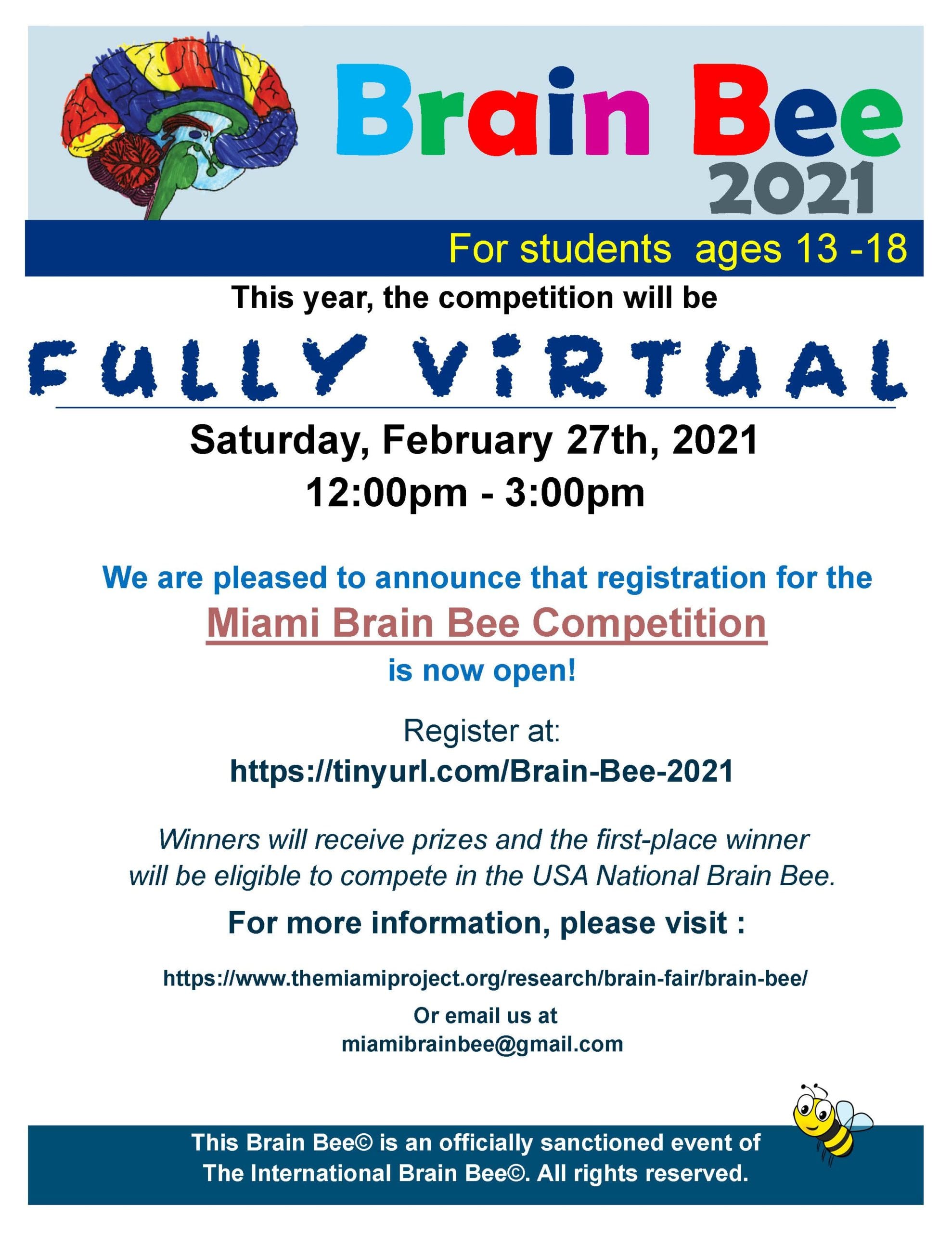 VIRTUAL Miami Brain Bee 2021 Calendar Tickets Add to Calendar Add to Timely Calendar Add to Google Add to Outlook Add to Apple Calendar Add to other calendar Export to XML When: February 27, 2021 @ 12:00 pm – 3:00 pm 2021-02-27T12:00:00-05:00 2021-02-27T15:00:00-05:00 Contact: Email Scientific Event The Miami Project REGISTER Brain Bee 2021